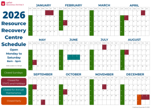 The Resource Recovery Centre is open Monday to Saturday, 8 a.m. to 5 p.m. Closed statutory holidays.