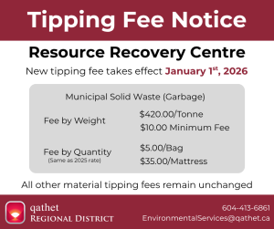 | Accepted Materials: | “Lasqueti Island residential waste” means refuse that originates from residential, commercial and institutional sources but does not include Construction, Renovation and Demolition Waste, Prohibited Waste, Recyclable Materials, Organics or Stewardship Materials as defined in qRD Solid Waste Regulation and Tipping Fee Bylaw No. 532, 2018 |